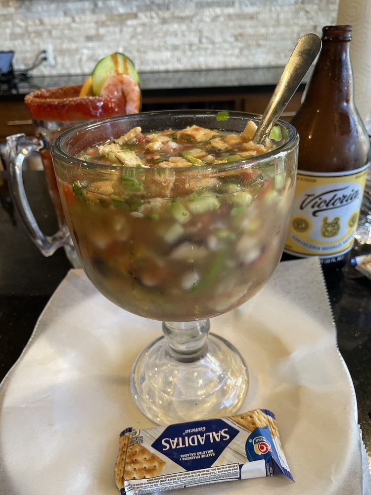 Raw fish, marinated in lemon juice, with onions, cilantro, and tomatoes.